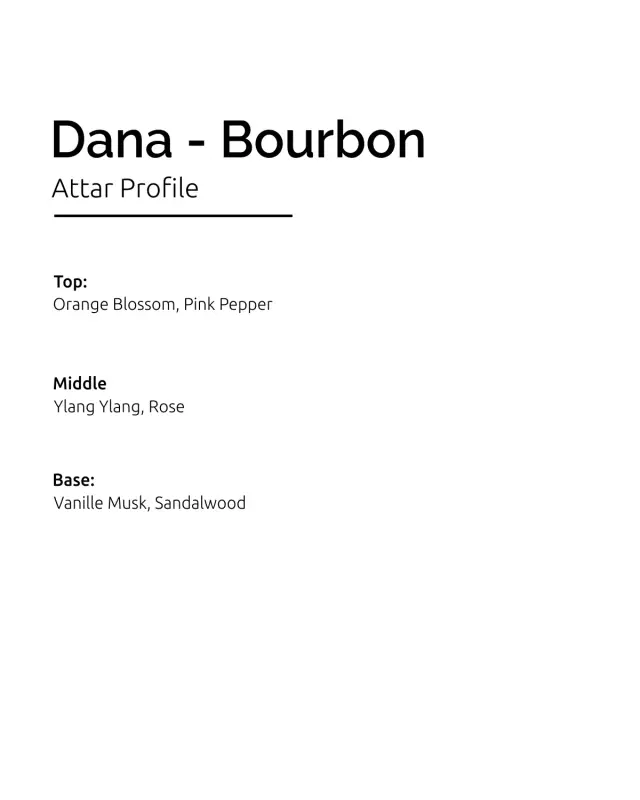 Product Overview: Dana – Bourbon is a bright and romantic attar combining the freshness of orange blossom and pink pepper with elegant florals, finishing with a warm, comforting base.