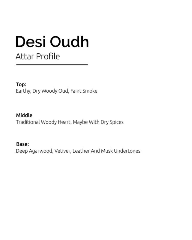 Product Overview: Desi Oudh is a robust, earthy Indian oud attar with rustic spice and resinous character—authentically local, richly textured.