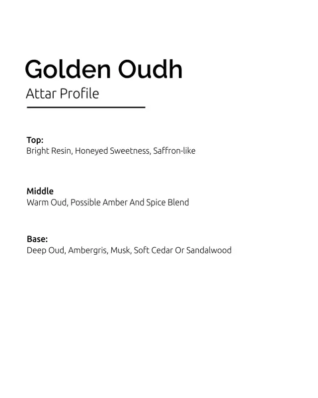 Product Overview: Golden Oudh combines precious saffron with noble oud and warm amber to create a regal, luminous attar.