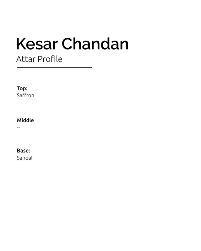 Product Overview: Kesar Chandan is a luxurious saffron-infused sandalwood attar, rich and deeply comforting.