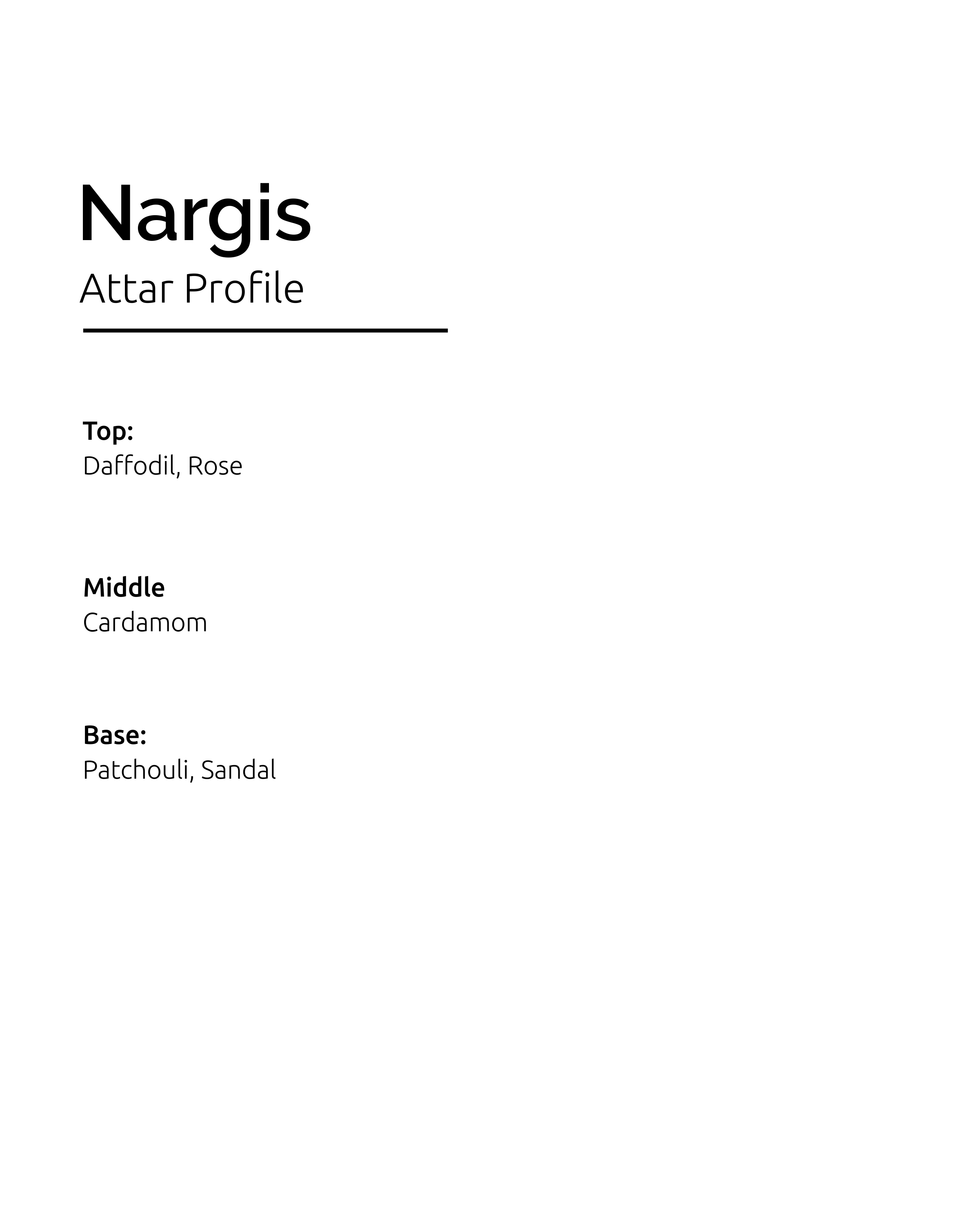 Product Overview: Nagis is a delicate floral-spicy attar, where daffodil and rose meet the warmth of cardamom, resting on a soft patchouli-sandal base.
