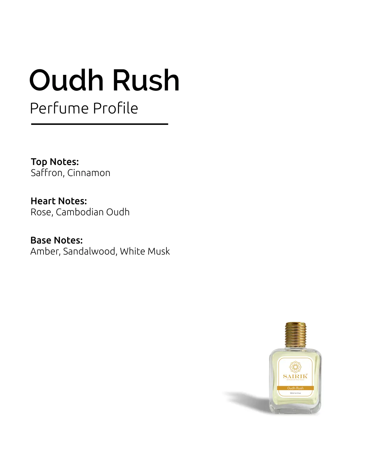 Product Overview: Inspired By Oudh Maracuja, Oudh Rush Is A Rich, Exotic Blend Of Saffron And Cinnamon, Layered With Rose And Cambodian Oudh, And Settled In A Luxurious Base Of Amber, Sandalwood, And White Musk.
