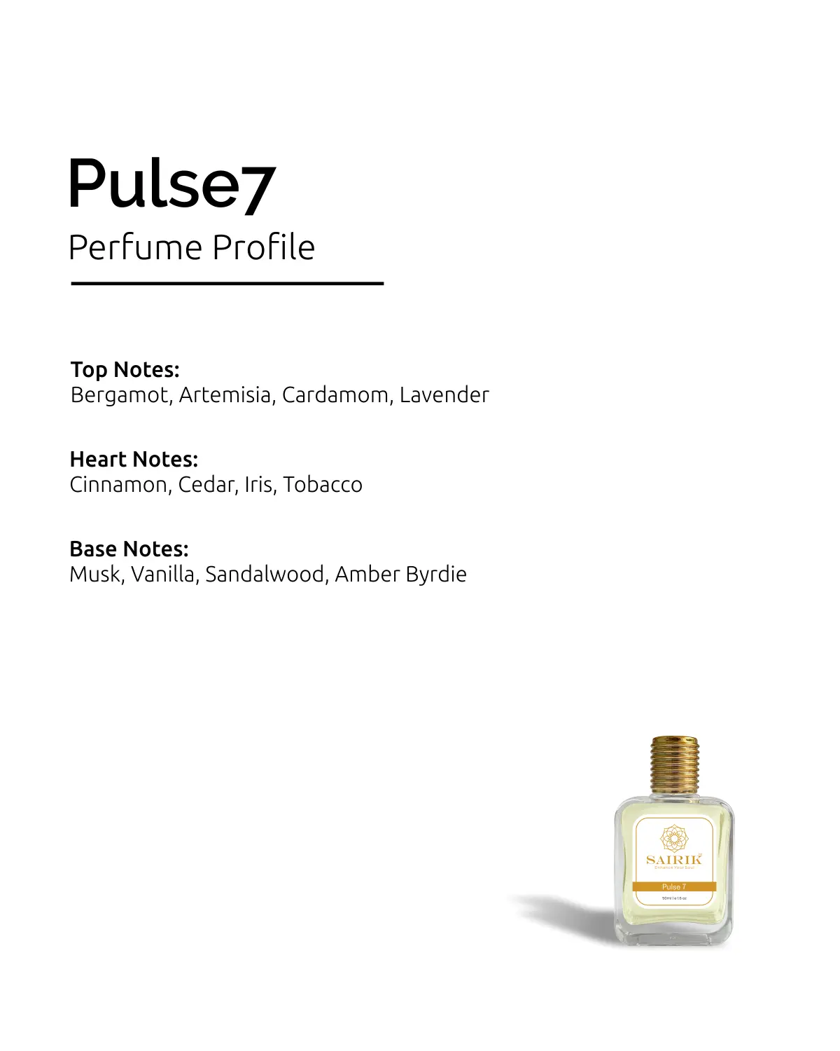 - Base: Musk, Vanilla, Sandalwood, Amber
