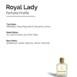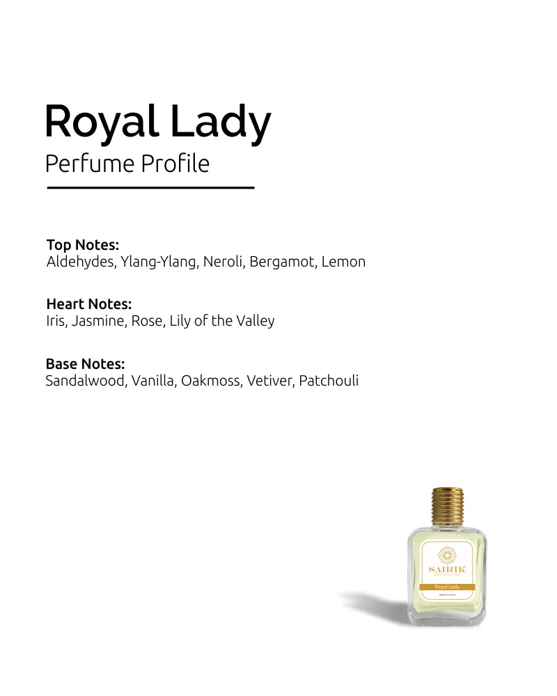 Product Overview: Inspired By The Timeless Chanel No. 5, Royal Lady Is A Classic Floral-aldehydic Blend. It Opens With Elegant Aldehydes And Neroli, Flows Into A Luxurious Heart Of Rose And Jasmine, And Finishes On A Warm, Powdery Base Of Sandalwood And Vanilla.