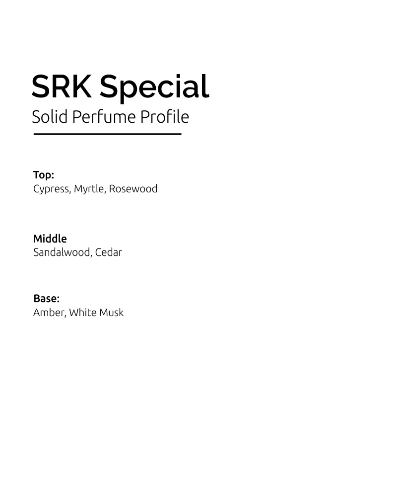 Product Overview: Calm, refined, and deeply grounding — SRK Special pays homage to the purity of sandalwood. A meditative balance of wood and musk that radiates quiet sophistication.