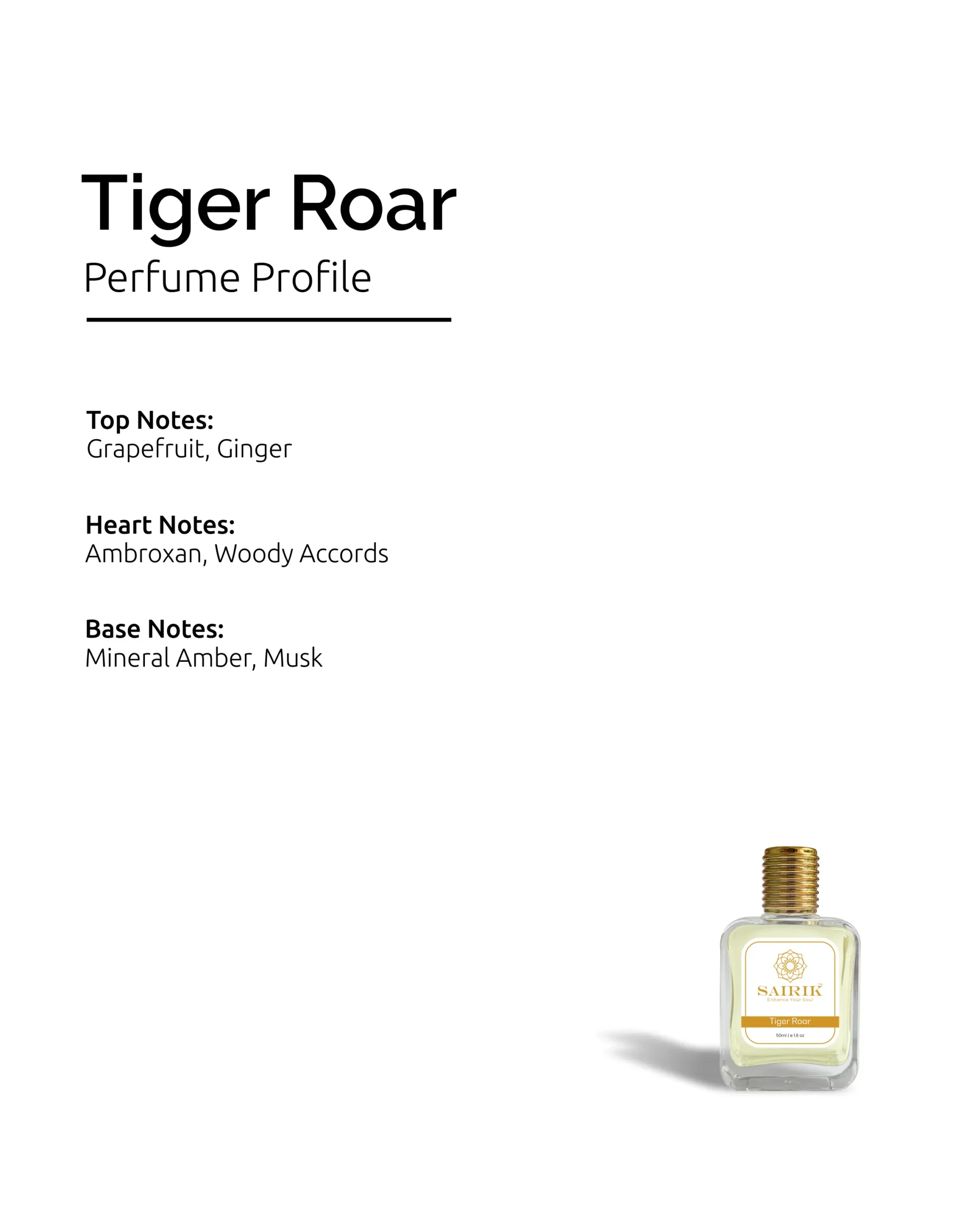 Product Overview: Inspired By Bvlgari Tygar, Tiger Roar Is A Striking Citrus-amber Fragrance That Radiates Raw Energy. It Opens With Zesty Grapefruit And Ginger, Transitions To A Vibrant Heart Of Ambroxan And Woody Accords, And Settles Into A Smooth, Mineral-amber Base.