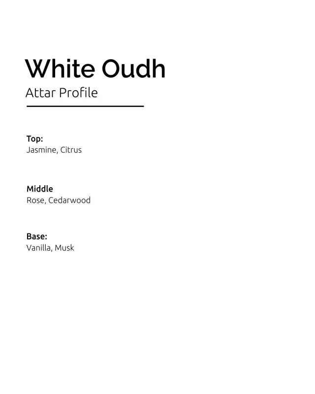 Product Overview: White Oudh is a soft and sophisticated attar with gentle citrus-floral notes, balanced by a creamy vanilla-musk finish.